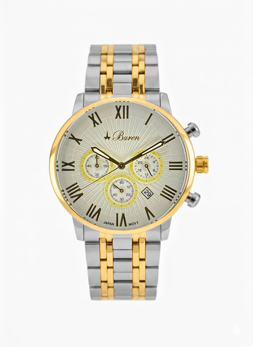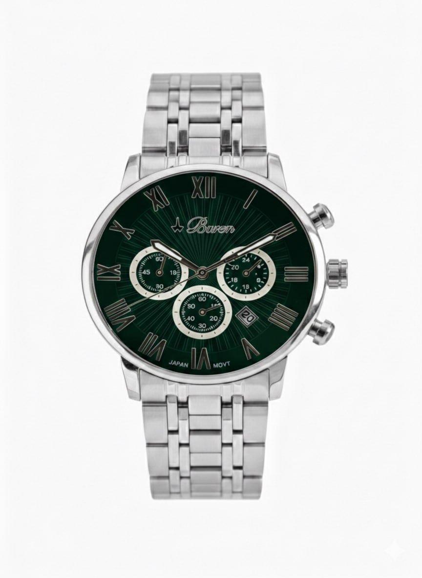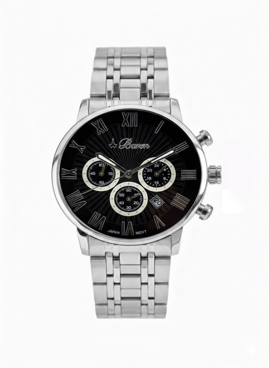 The watch is completed with a solid metal band, constructed from interlinked segments that provide durability, flexibility, and a secure fit. The materials used ensure long-lasting wear while maintaining a premium feel and strong structural integrity.